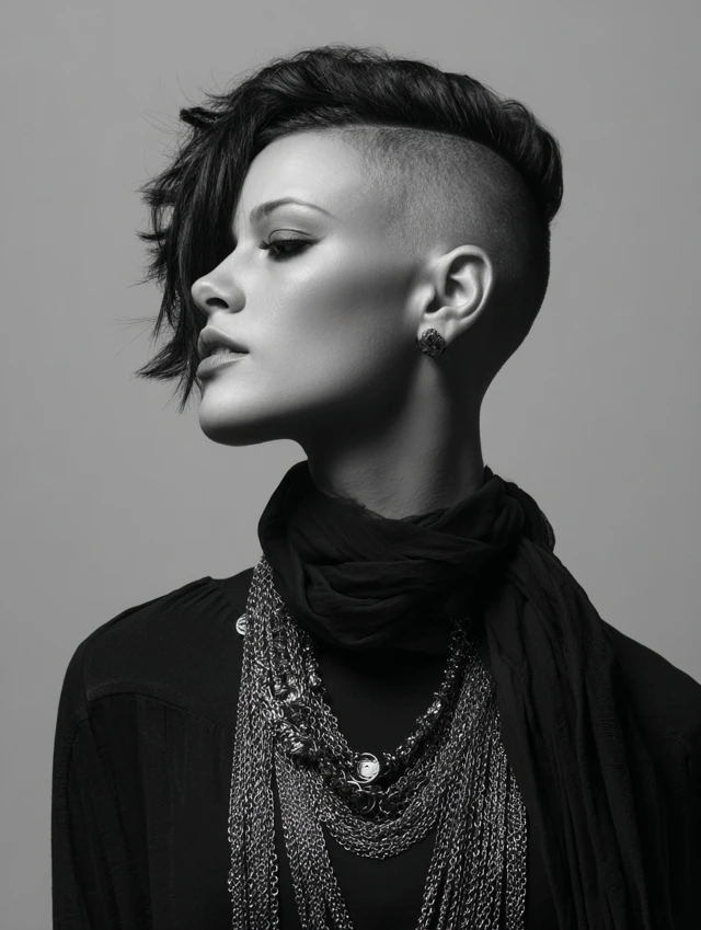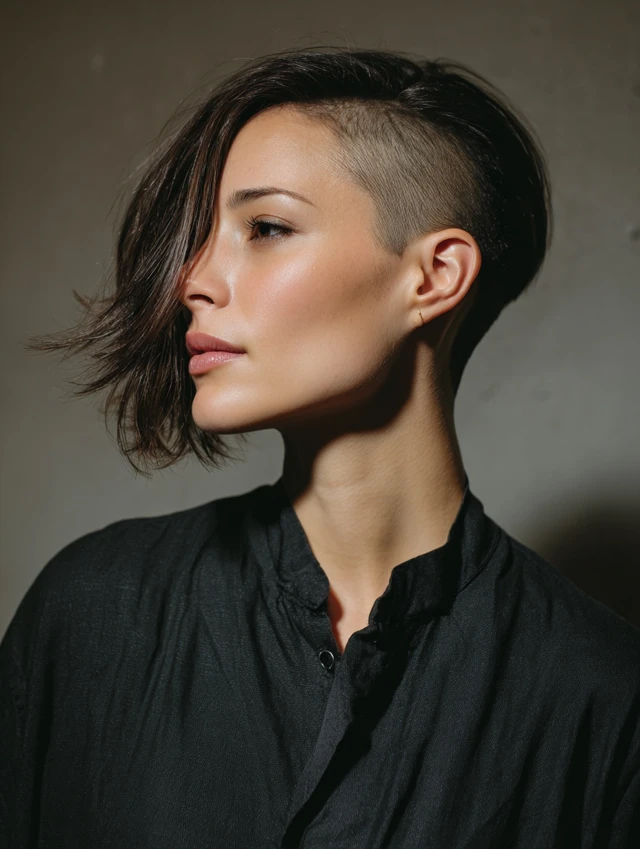 Add a fringe or side bangs to soften the shaved contrast. Works for oval and round faces, highlighting eyes and cheekbones.