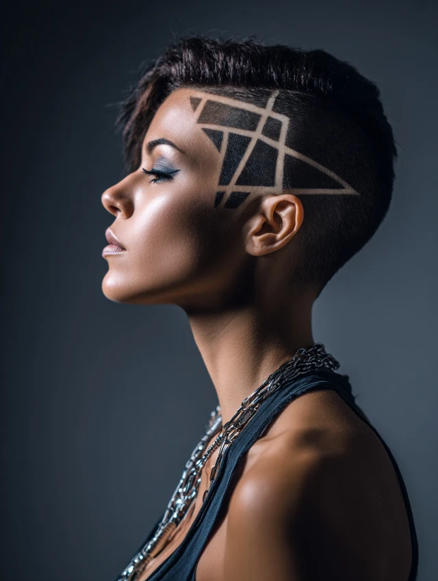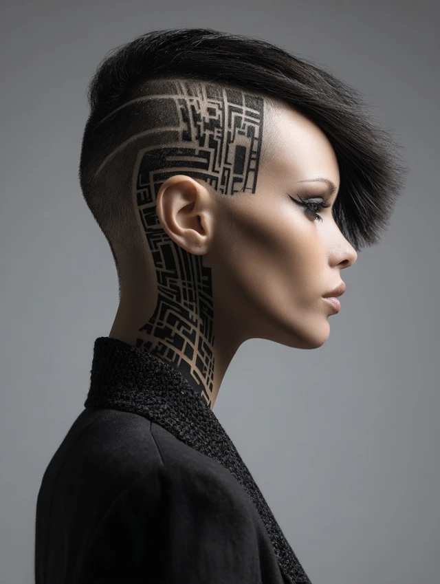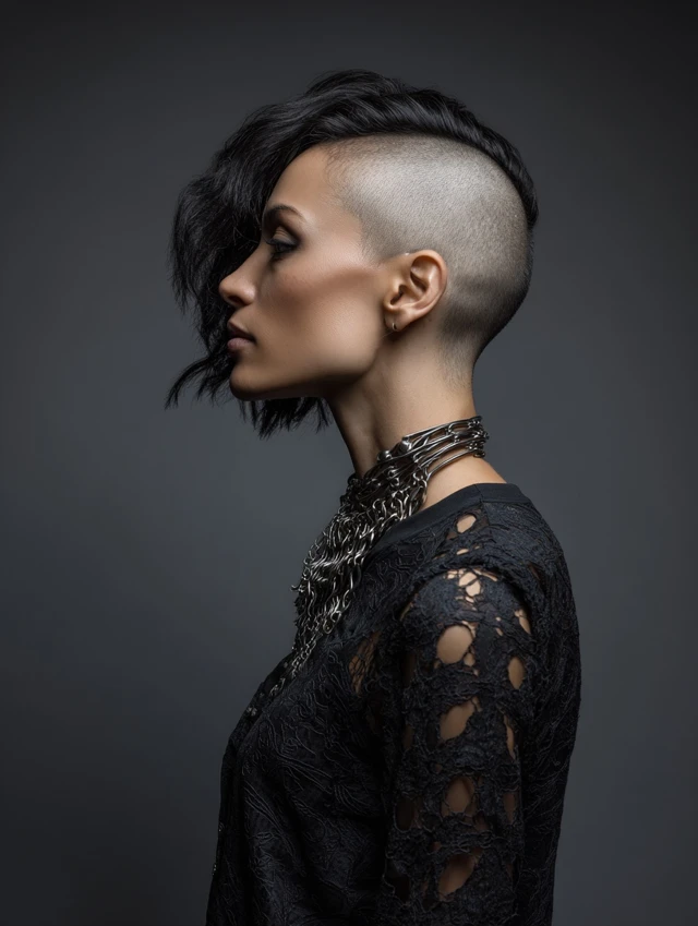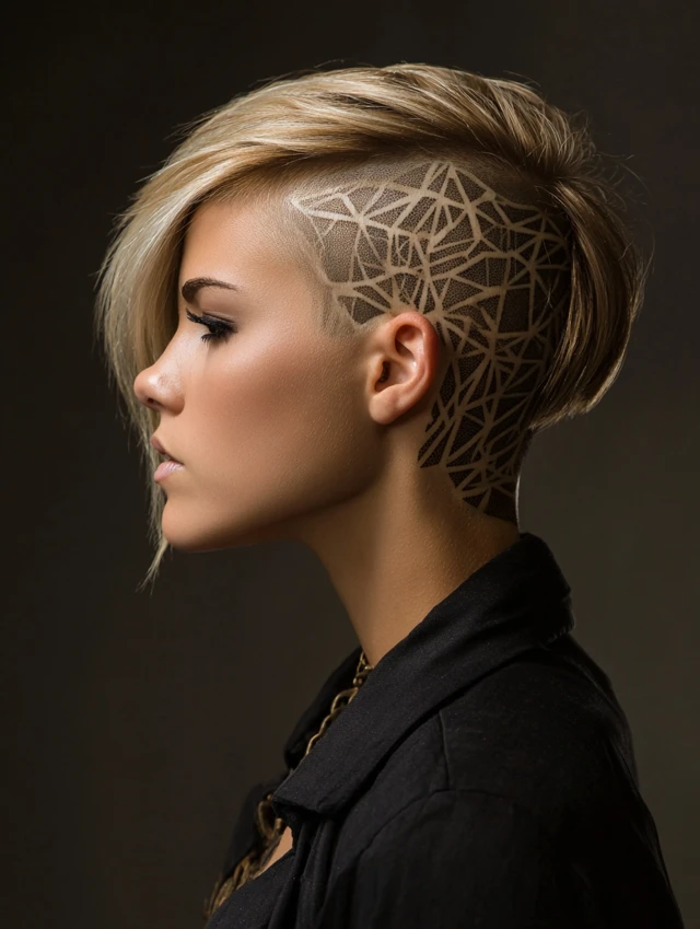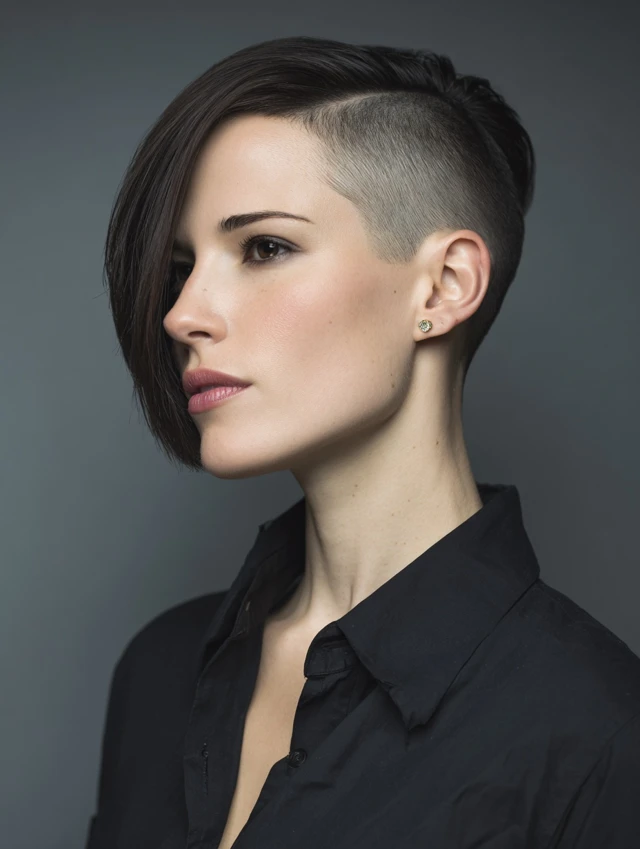 The entire side is shaved for maximum contrast, with longer hair on top. Works for oval and heart-shaped faces to highlight angles.