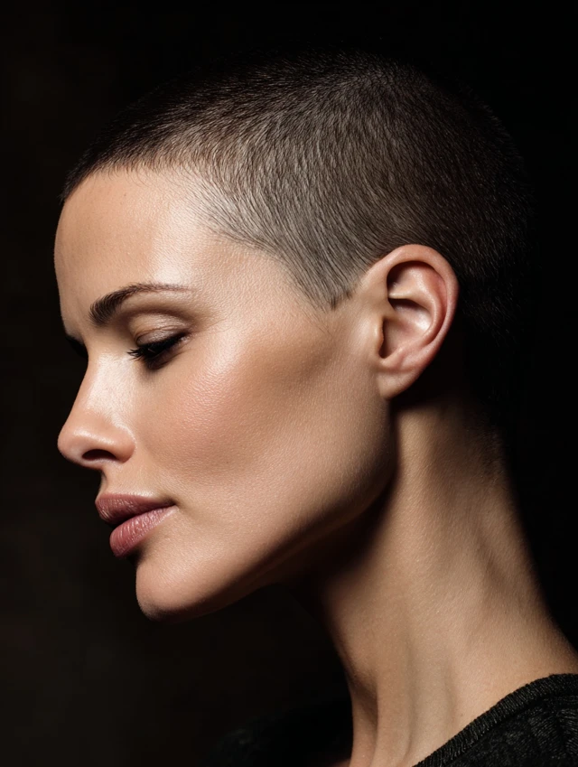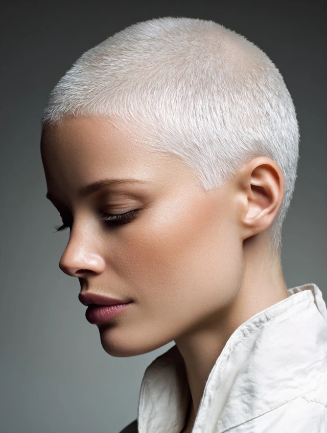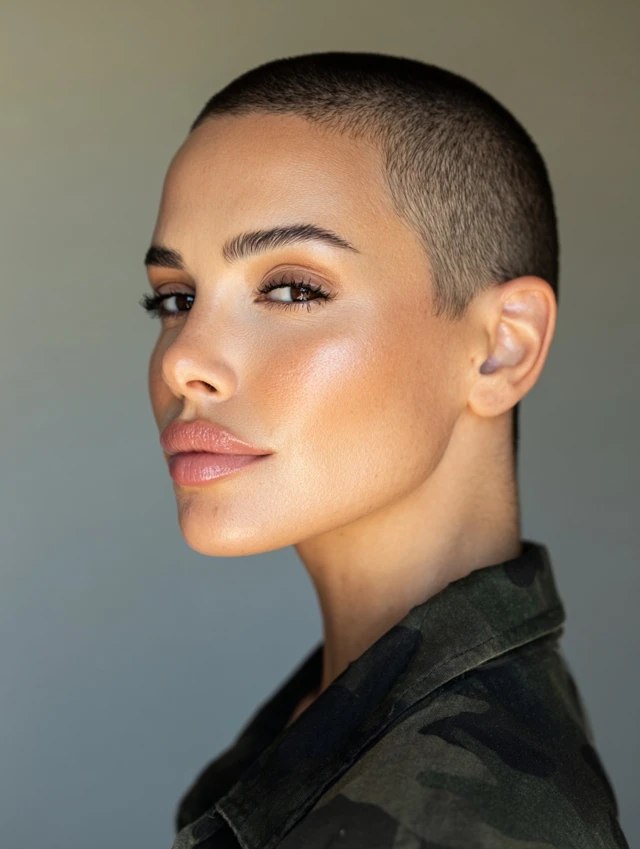 The buzz cut keeps hair evenly trimmed close to the scalp. This style works well for oval and heart-shaped faces because it highlights bone structure. It feels bold and direct.