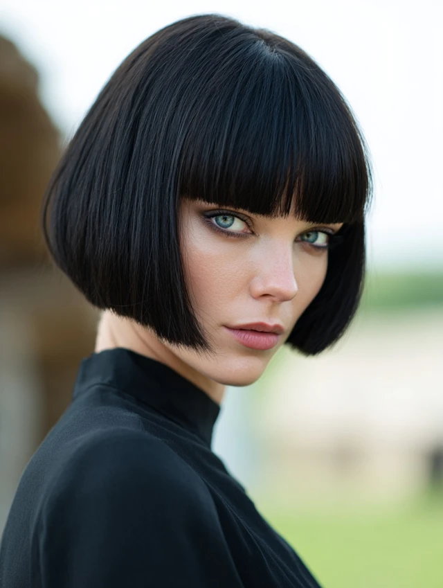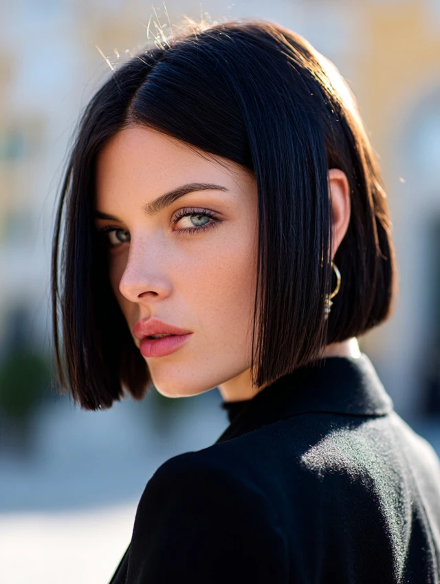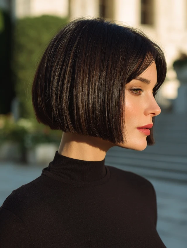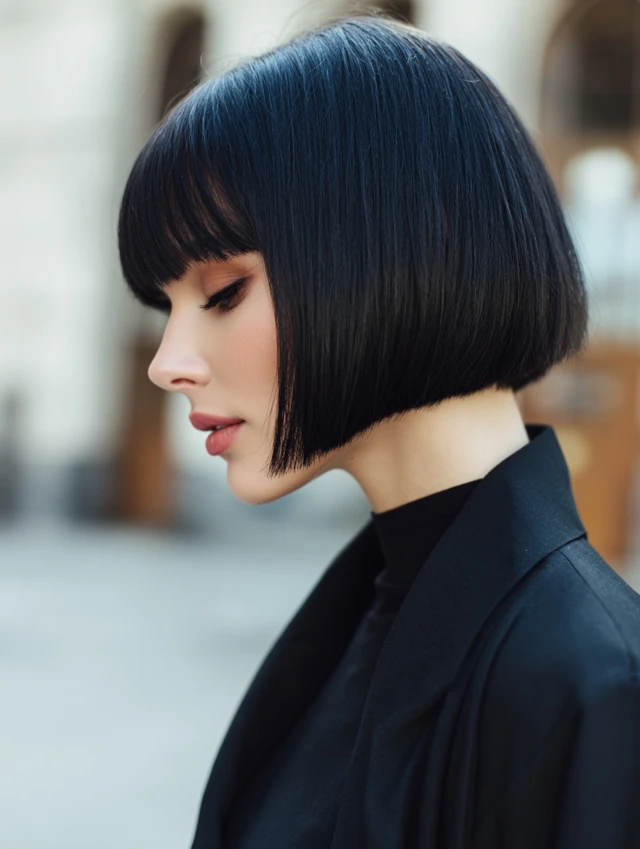 A micro bob sits above the jawline. The blunt edge creates a sharp outline. This works well for oval and square faces because it defines the jawline.