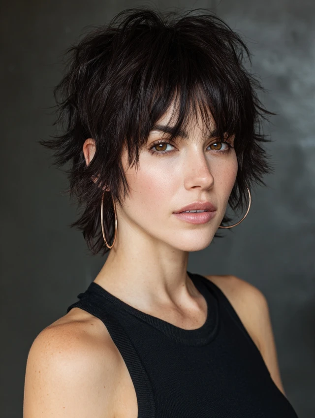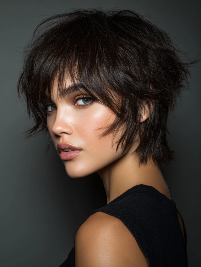 The shaggy crop adds texture and movement. Choppy layers prevent the cut from looking too flat. This works well for fine to medium hair types.