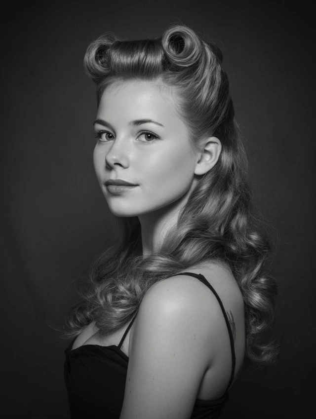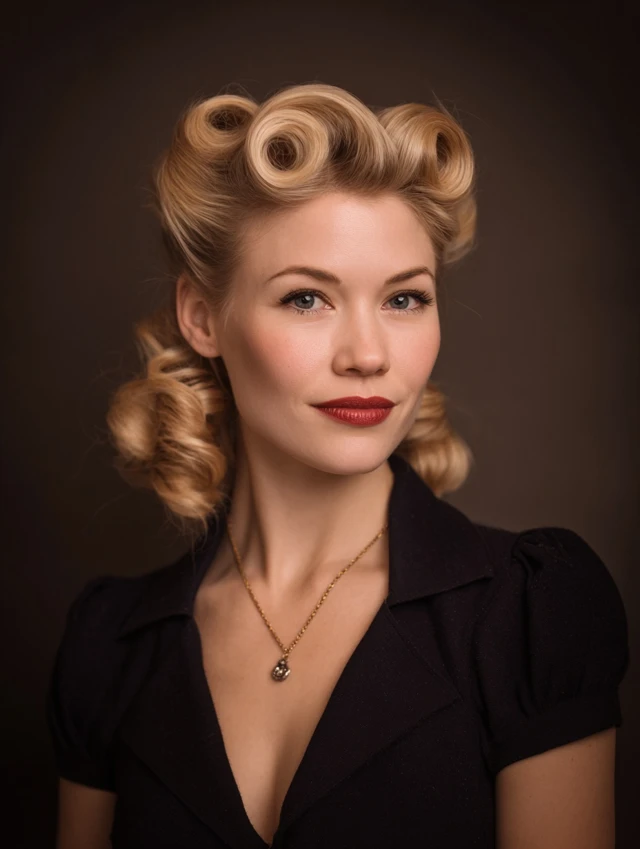Blow-dry hair smooth, then roll and pin sections with bobby pins. Medium to long hair works best. Maintenance is moderate; keep pins and hairspray ready. Ideal for themed parties or vintage-inspired events.