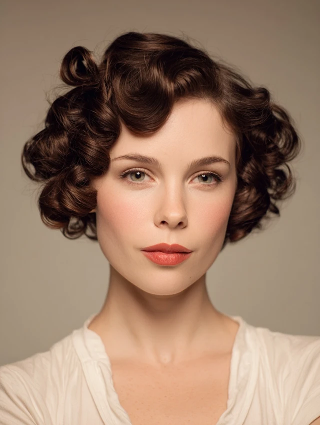 Small, uniform curls set with pins for defined vintage waves. Works for oval and heart-shaped faces, softening angles.