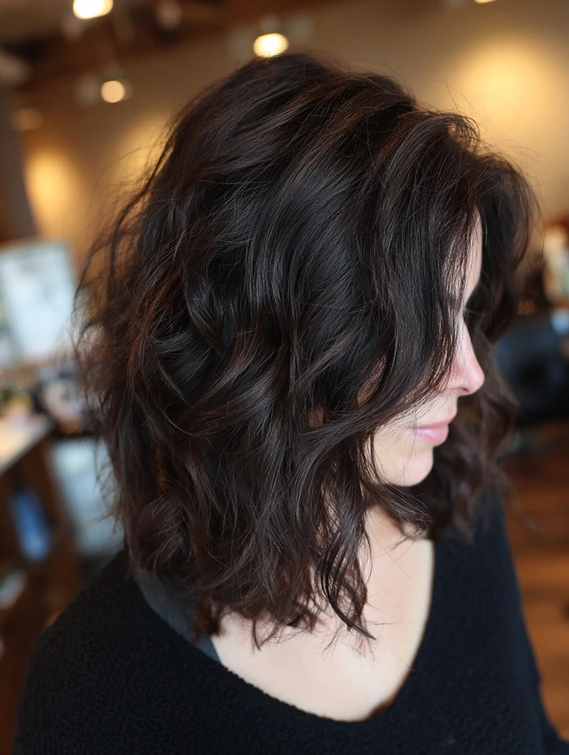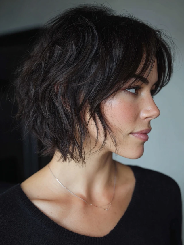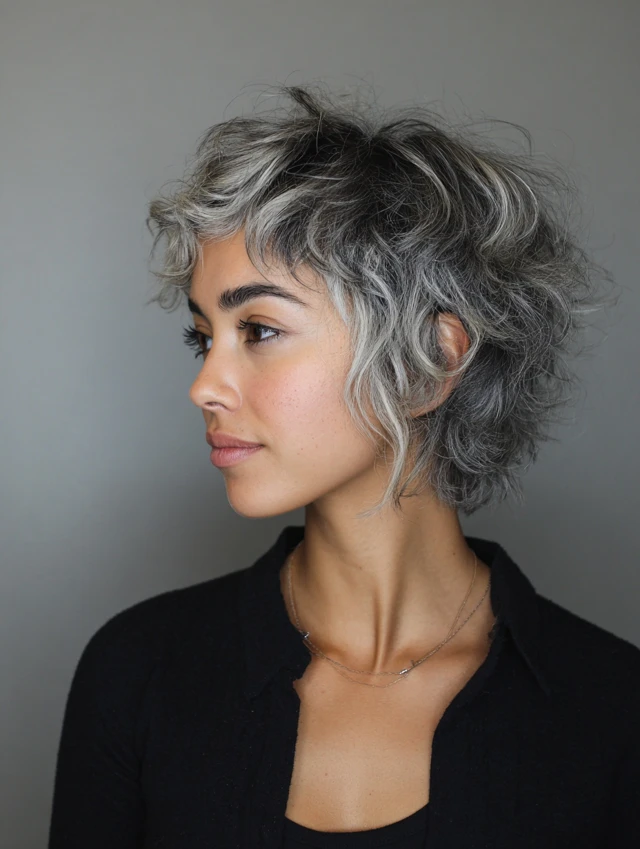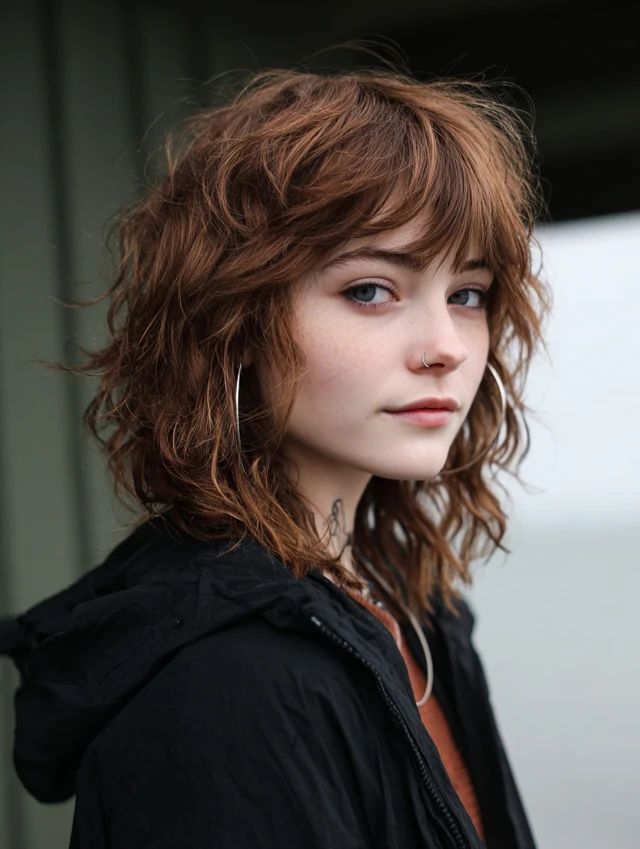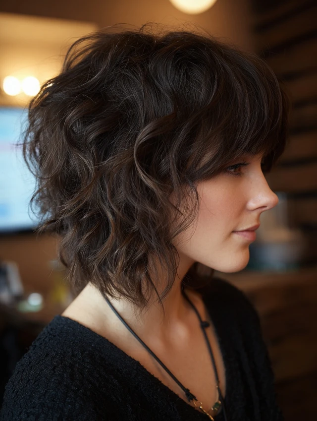 A short wavy wolf cut emphasizes texture and shape. The shorter length builds volume quickly and highlights cheekbones. It works well for fine to medium hair that needs fullness.