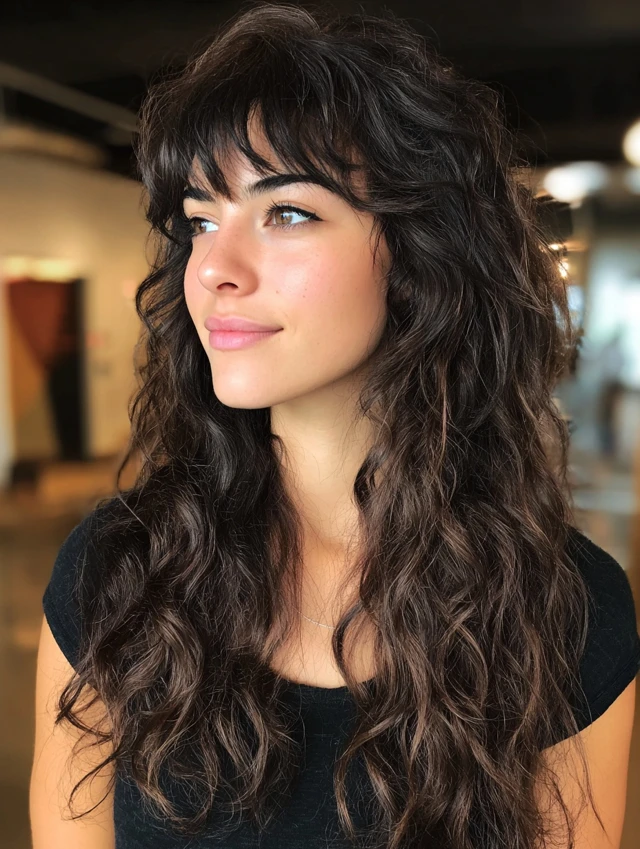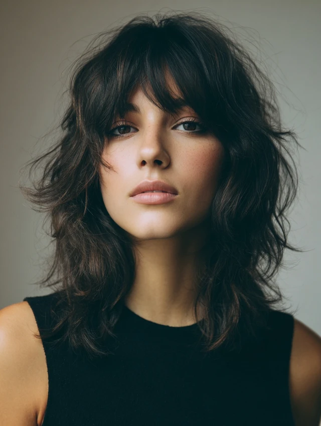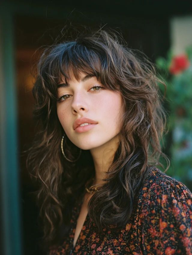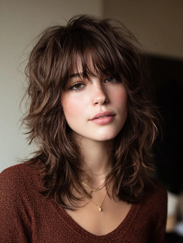 Curtain bangs soften the front of a wavy wolf cut. They blend into the side layers and frame the eyes naturally. This flatters heart and oval face shapes.