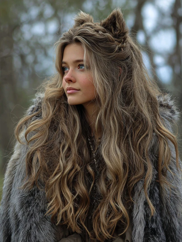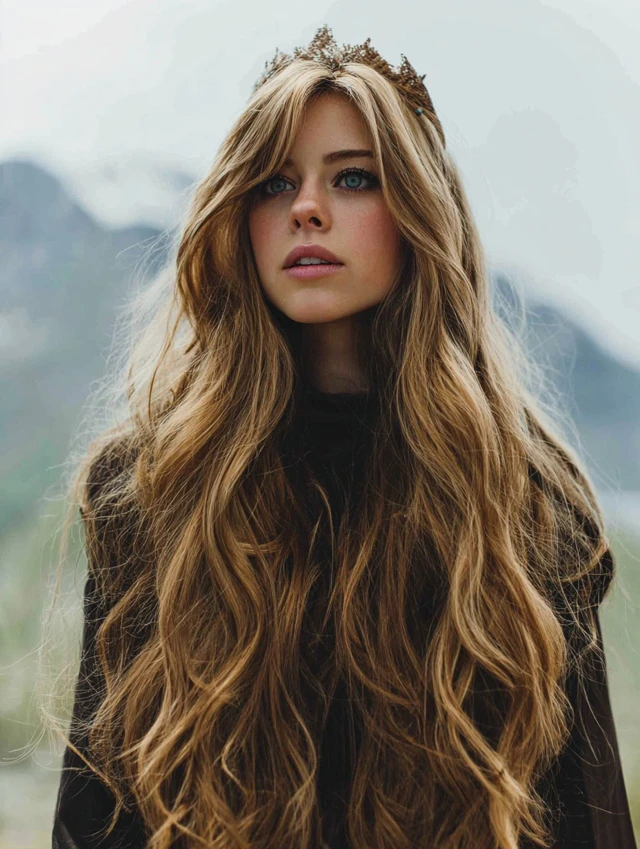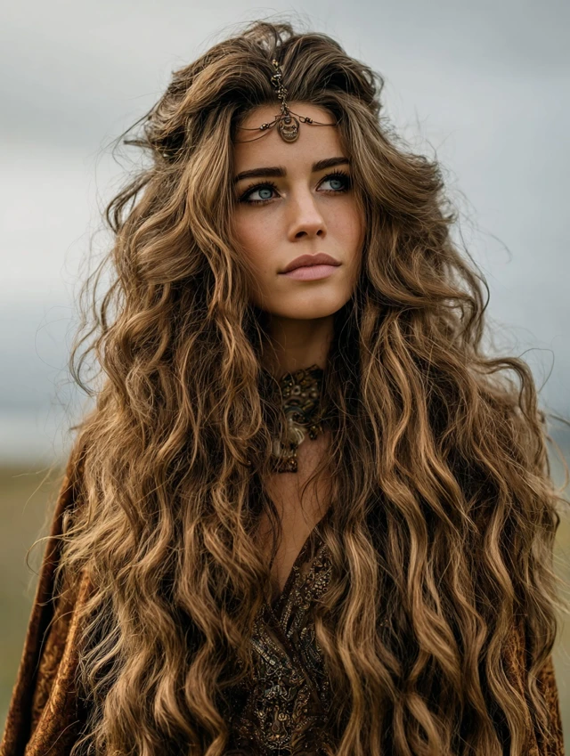 The long wavy wolf cut keeps dramatic length while adding height at the crown. Layers start higher and cascade downward. This suits round faces because it elongates the silhouette.
