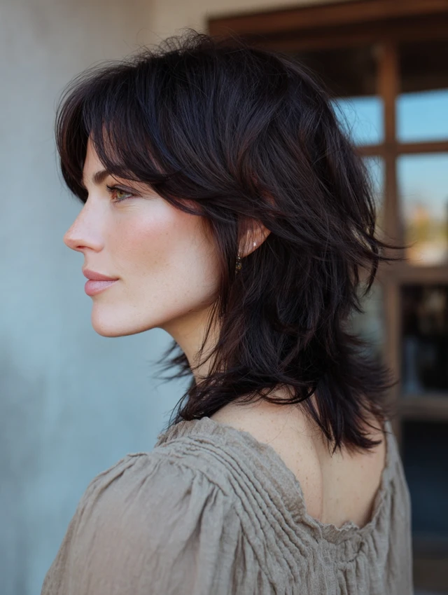 This wavy wolf cut keeps medium length with balanced layers. The crown holds lift while the ends stay airy. It works best for naturally wavy, medium-density hair.