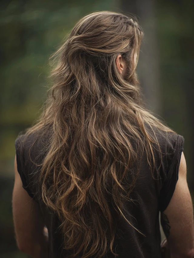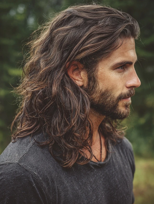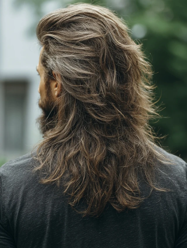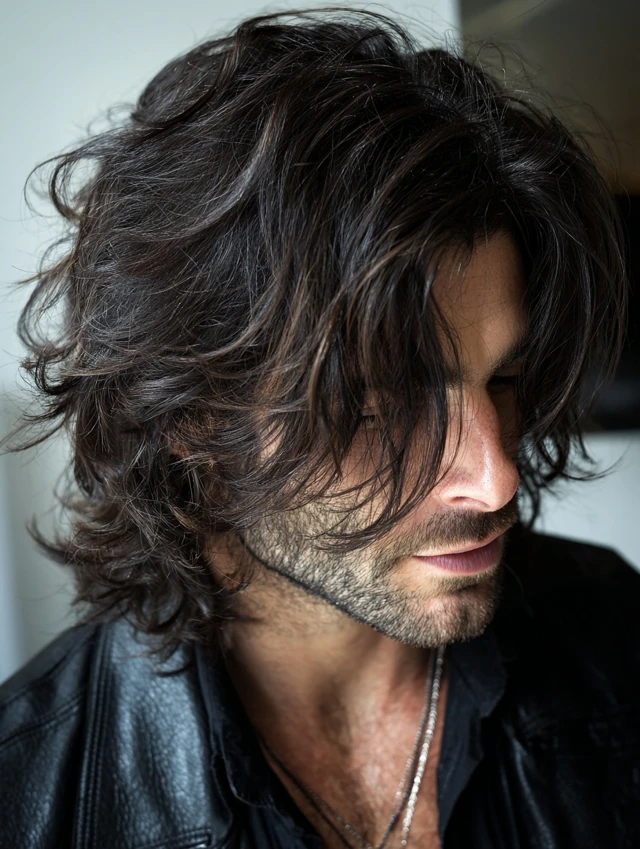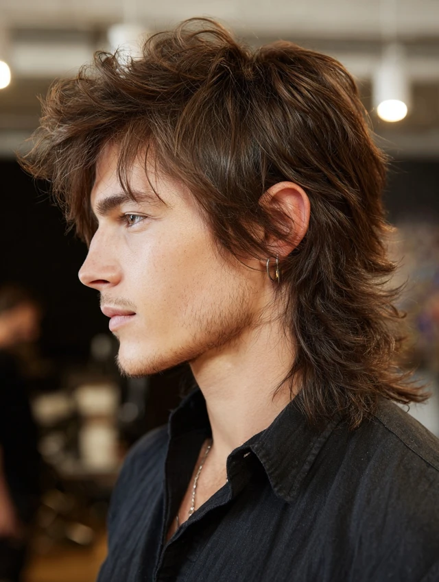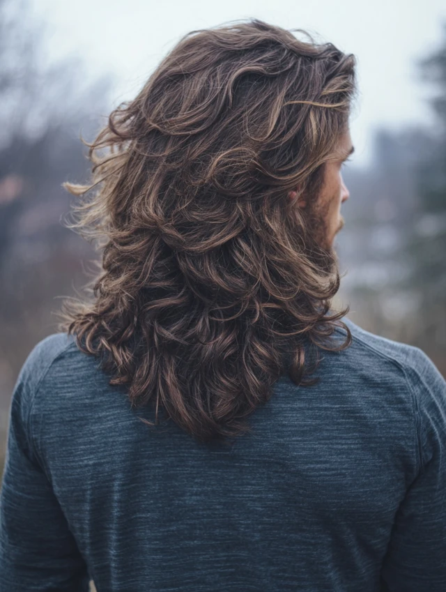 The long wolf cut men option keeps dramatic back length. The crown stays textured while the ends flow past the neck. This suits wavy or thick hair types.