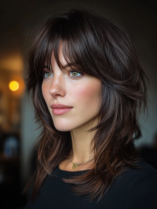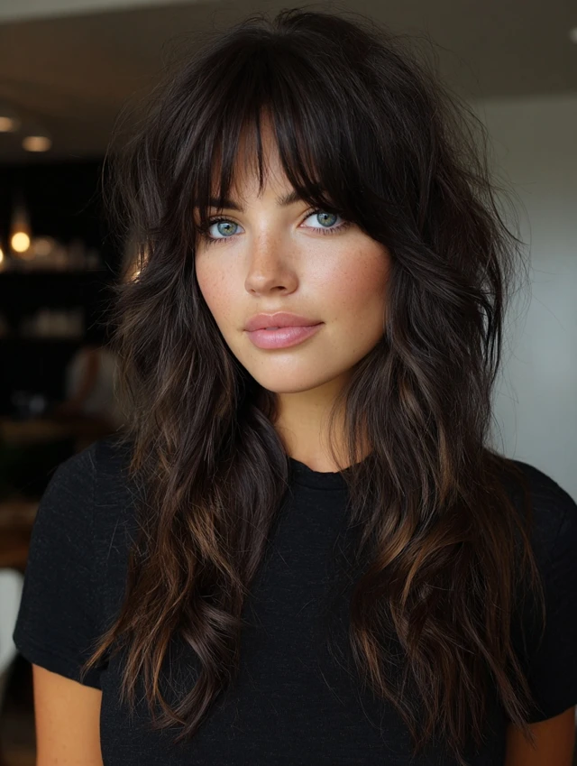 The wolf cut with bangs adds personality without losing structure. The layers create movement. The fringe adds definition. You can make it soft or dramatic depending on the bang style.