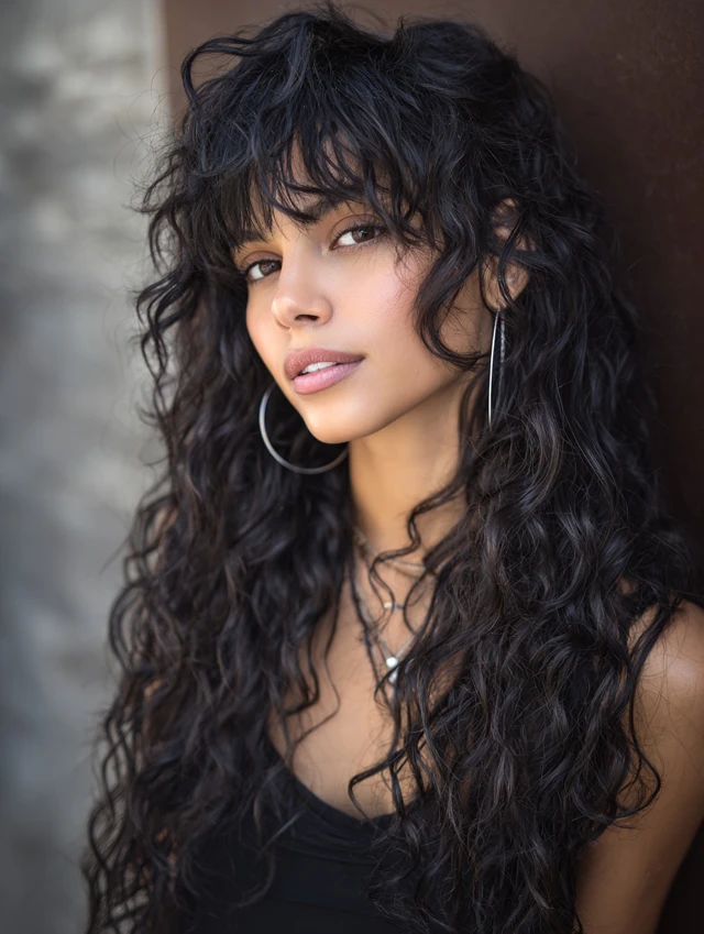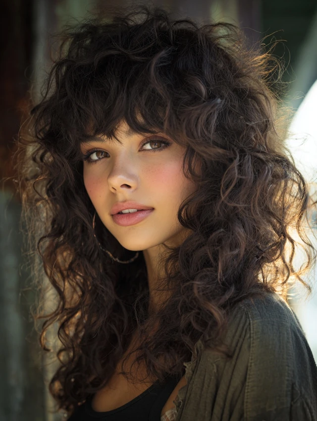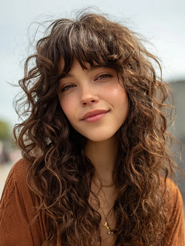 Curly hair transforms beautifully with bangs. The layered crown builds height while curly fringe frames the forehead. This prevents heavy bulk at the bottom.