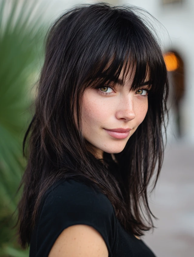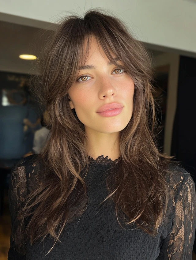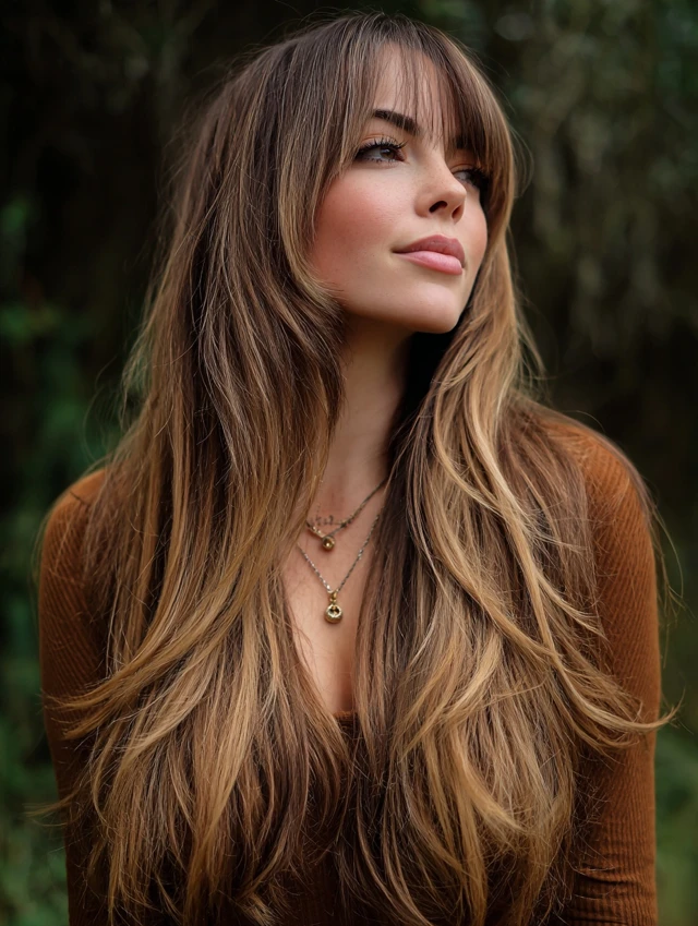 Wispy bangs keep the look soft and airy. The lighter fringe blends into the crown layers smoothly. It flatters round and square faces by adding gentle framing.