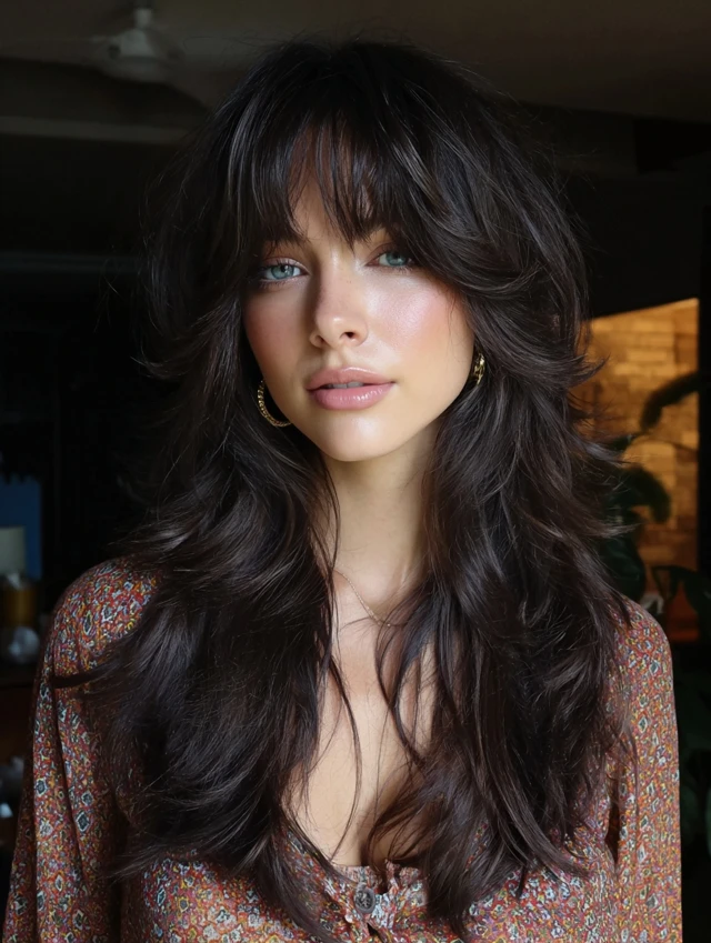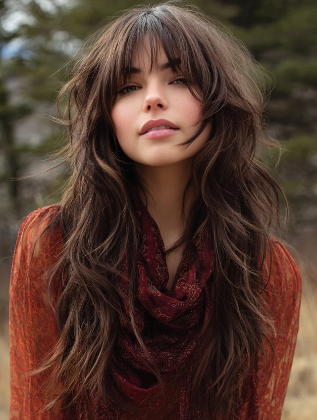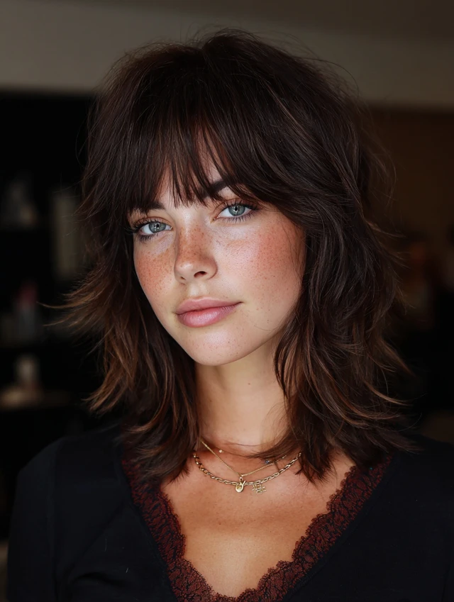 Blunt bangs create contrast against the shag layers. The straight fringe sharpens the overall silhouette. This works well for straight or slightly wavy hair.