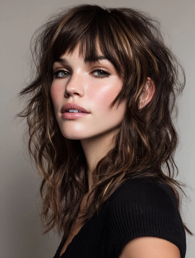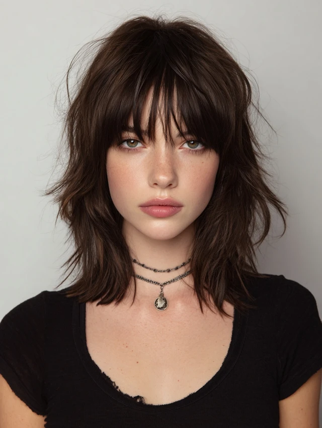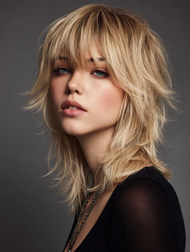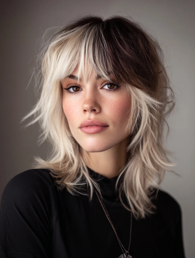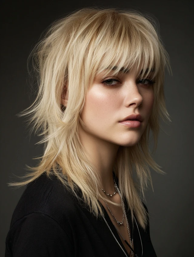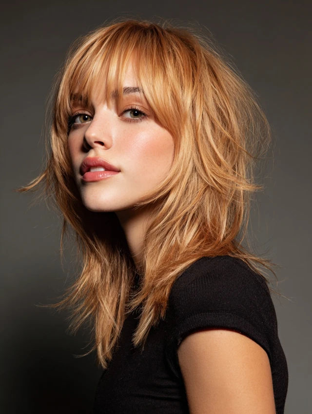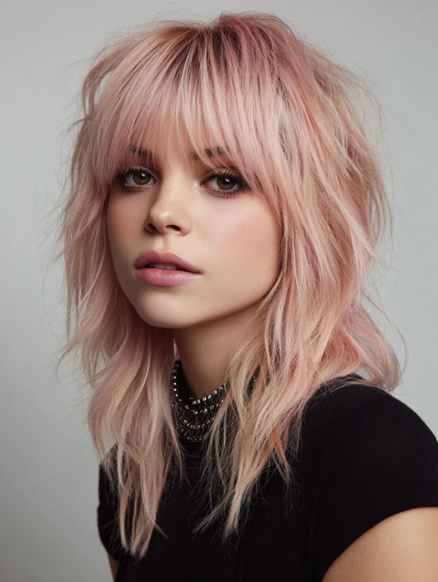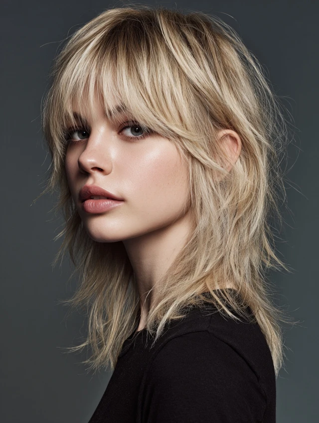 Light blonde or caramel bangs soften the edgy wolf cut. Works for most face shapes, balancing strong layers.