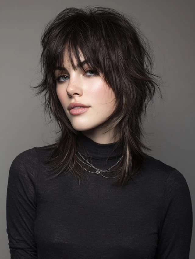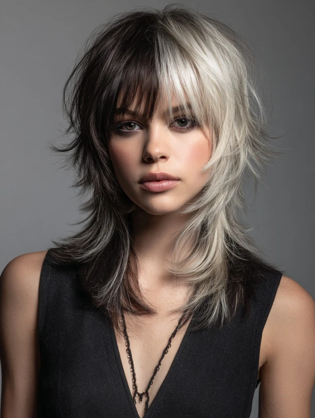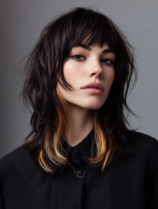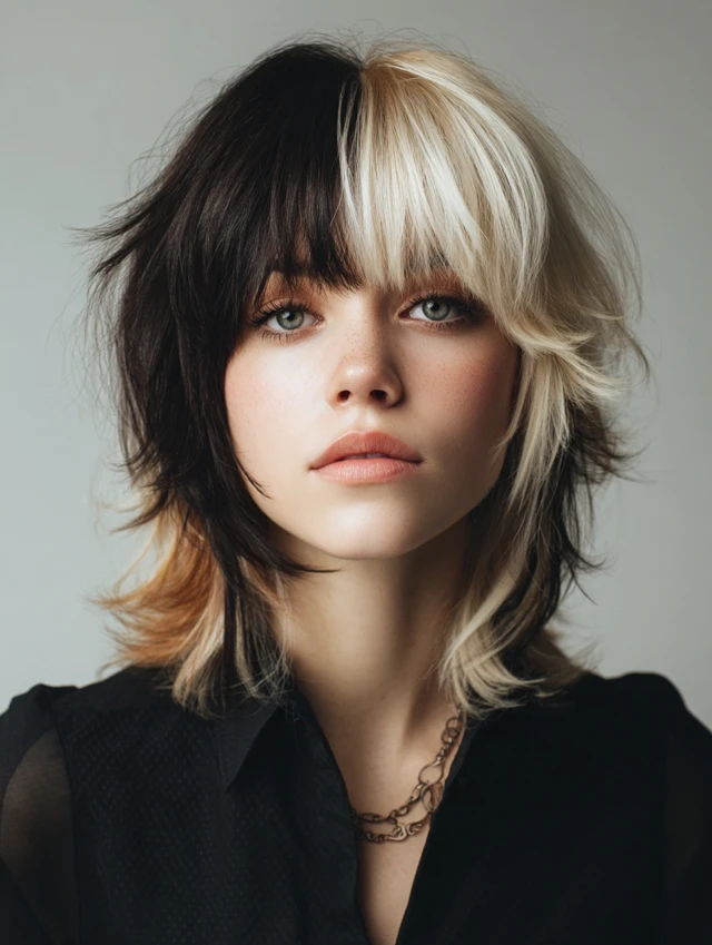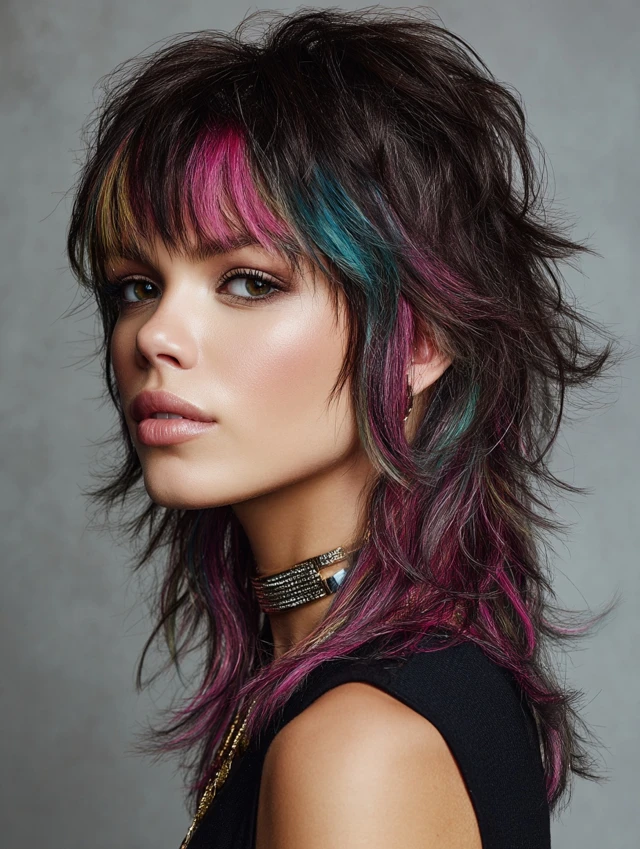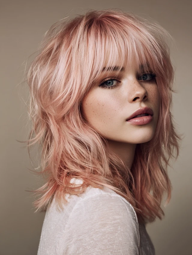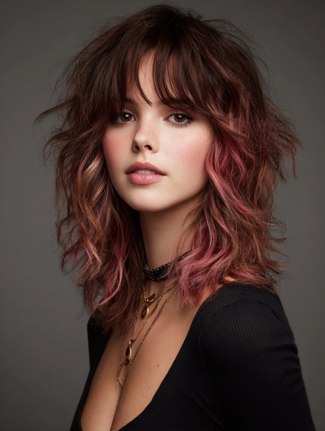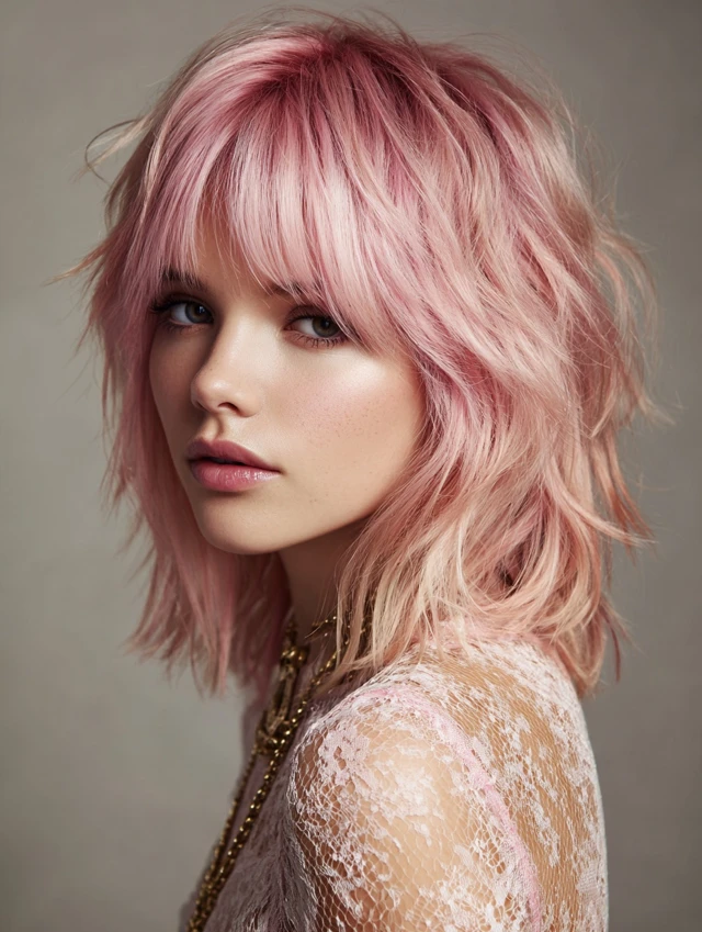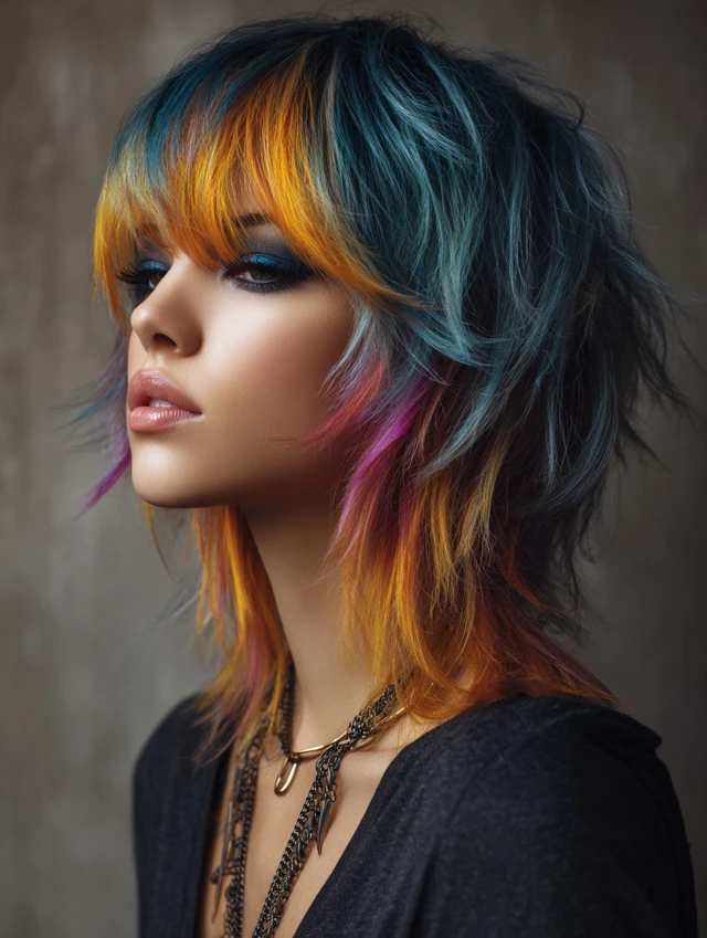 A wolf cut with coloured bangs combines edgy, voluminous layers with a striking pop of color at the front. The wolf cut adds texture and movement, while coloured bangs create a focal point, making the hairstyle bold and playful. This style works for medium to thick hair and suits various face shapes, especially oval, round, and heart-shaped faces. Whether you choose pastel, neon, or subtle shades, coloured bangs add personality and dimension, making the wolf cut versatile for casual, formal, or fashion-forward occasions.