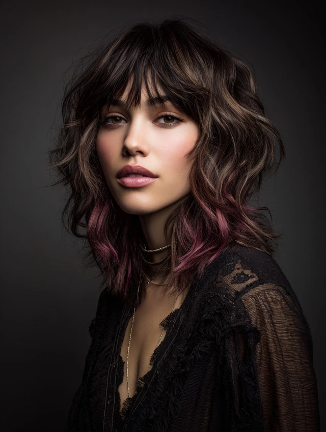 Hidden coloured bangs beneath natural layers reveal subtle pops of color. Works for all face shapes, adding dimension without being overwhelming.