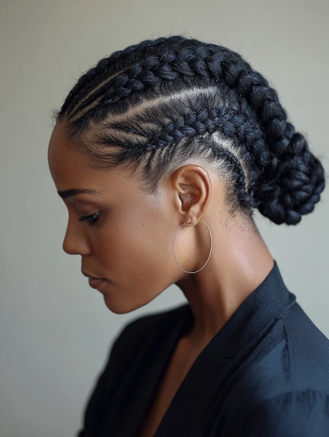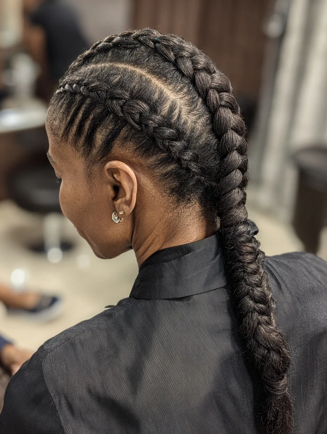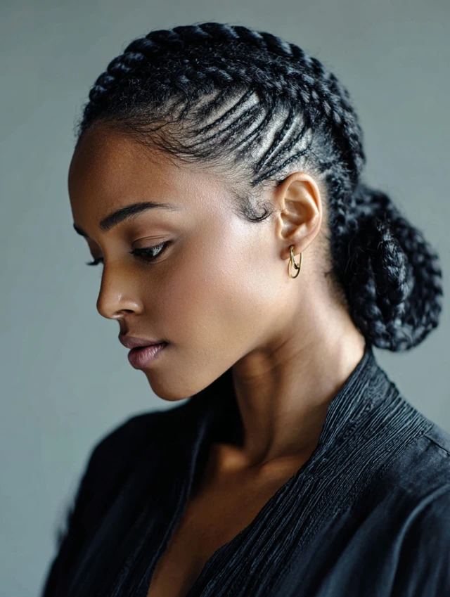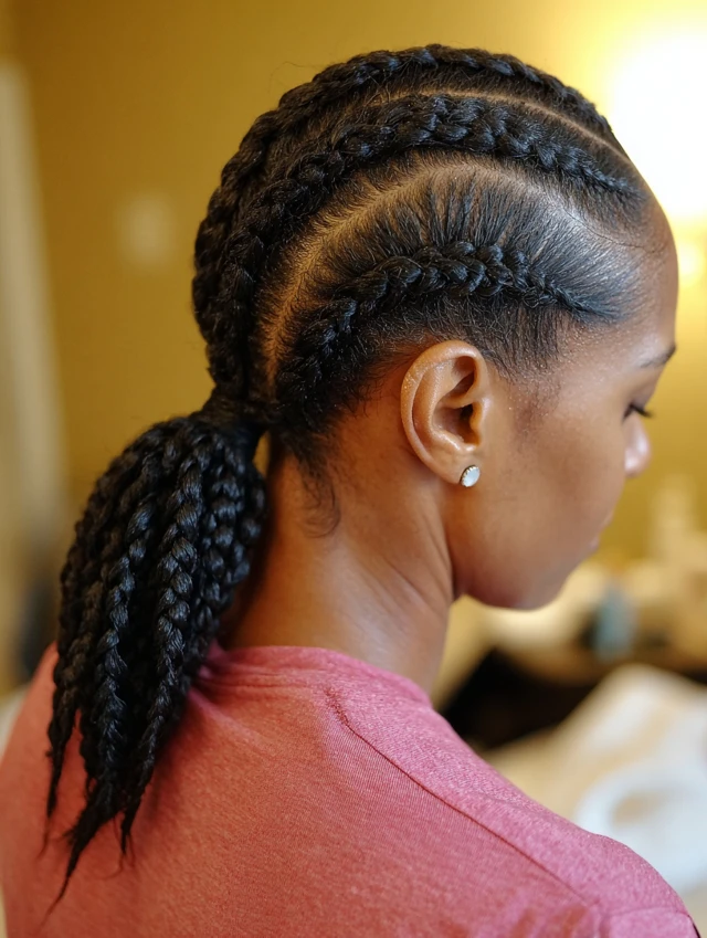 Cornrows along the scalp flow into a single ponytail or braided tail. The look feels controlled and modern while staying protective. It suits oval and rectangular faces and keeps hair off the shoulders during busy hours.