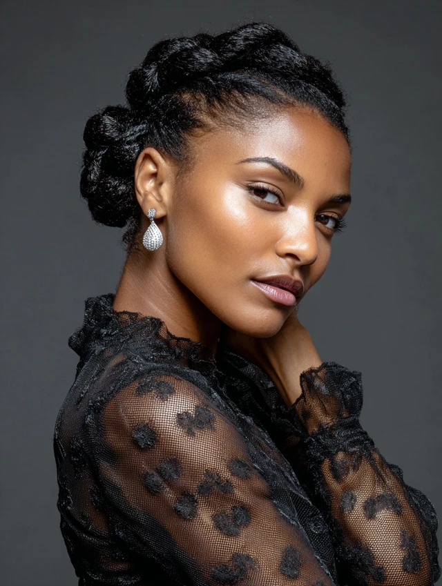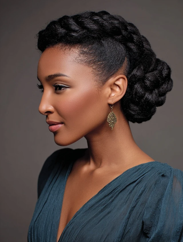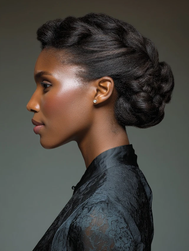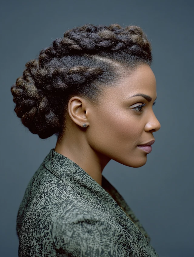 Flat twists wrap around the head and gather into a tucked bun or roll. The design frames the face and controls volume while staying elegant. It works well for round or heart-shaped faces because it adds height on top.