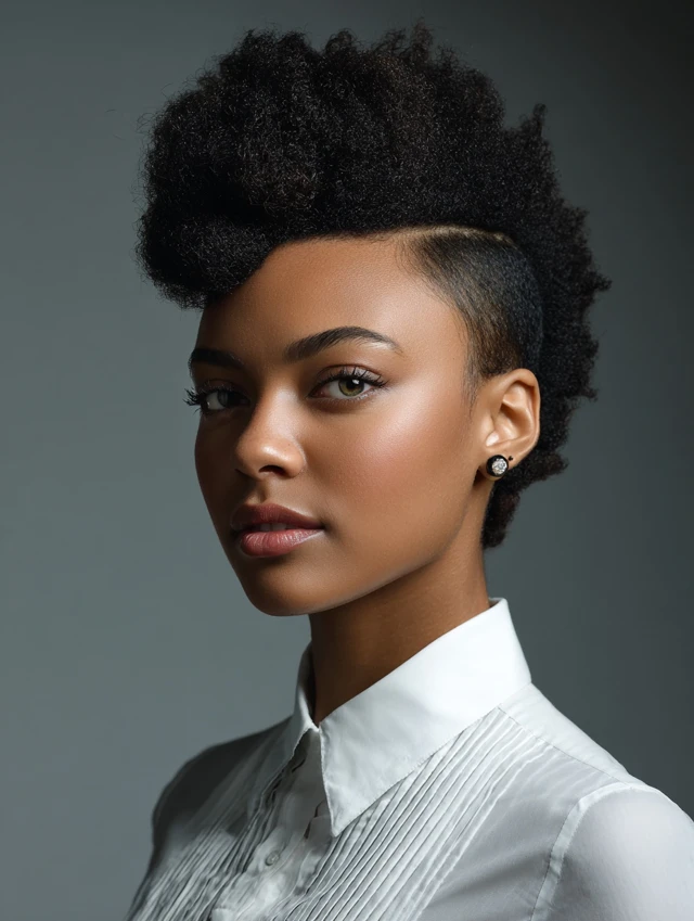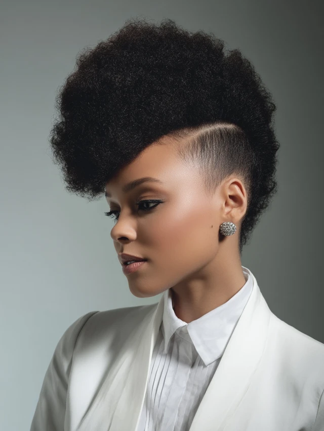 A puff sits high or mid-crown, paired with a sharp side or center part. That structure makes it office-friendly. The lifted shape draws attention upward and keeps curls from crowding the face.