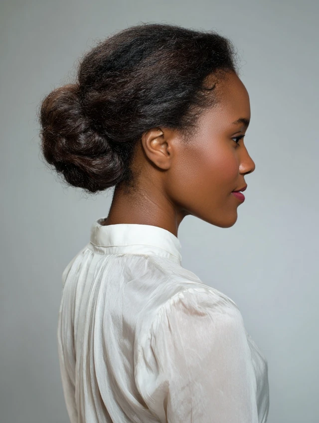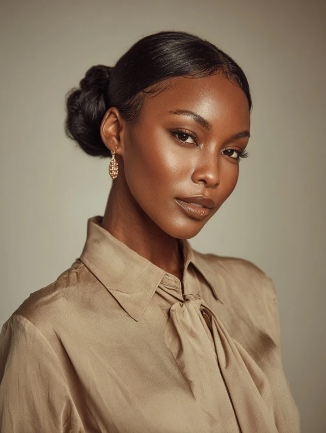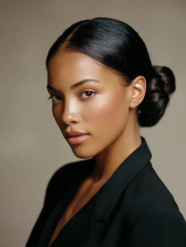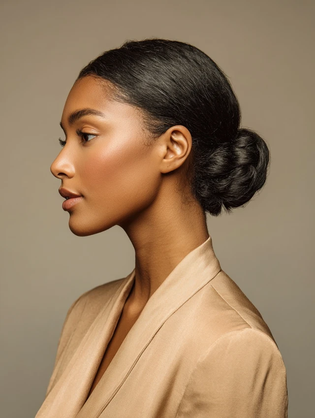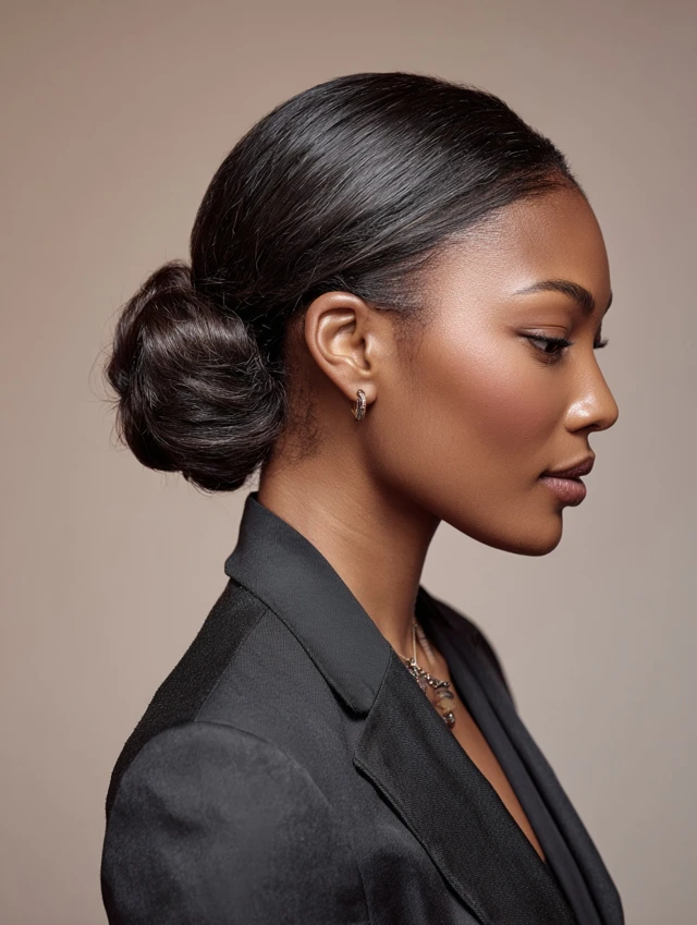 This style smooths hair into a neat bun at the nape. It flatters most face shapes and highlights cheekbones. A middle or side part adds structure. Keeping the bun low prevents tension and keeps the silhouette clean for professional spaces.