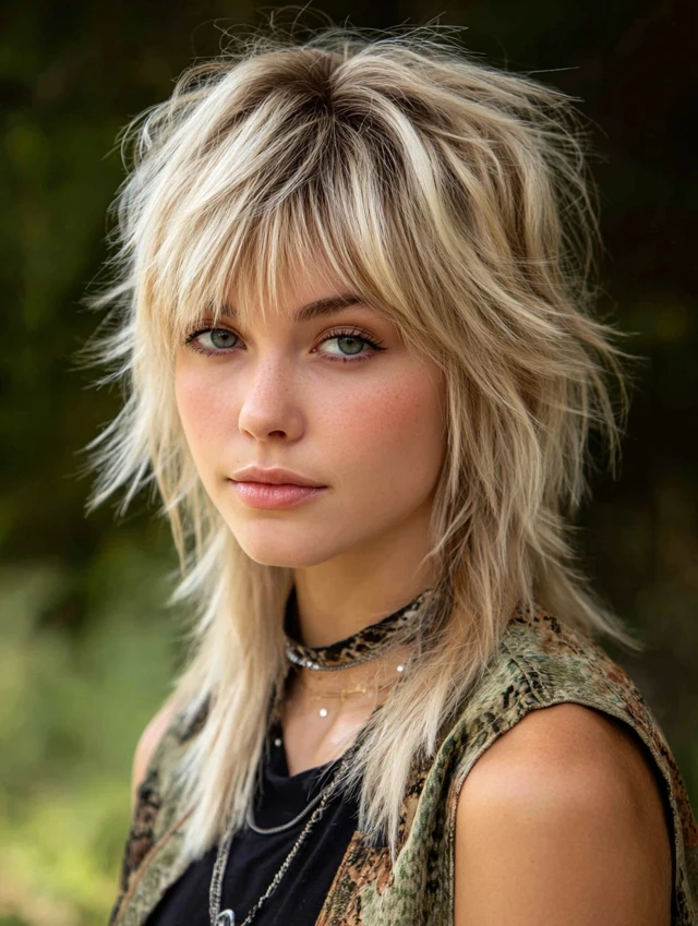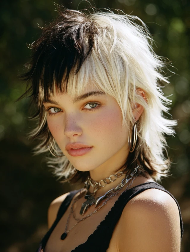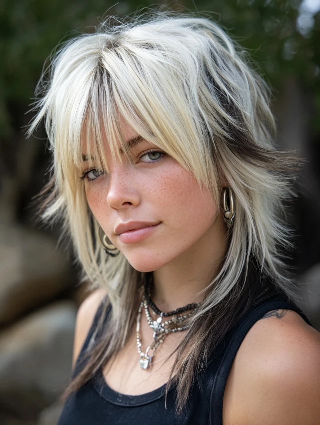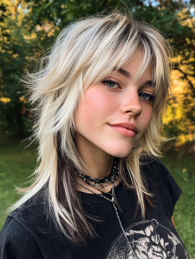 Adding skunk streaks to a wolf cut enhances the layered texture. The blonde pieces highlight the choppy structure. This works well for round and square faces because the volume elongates the shape.