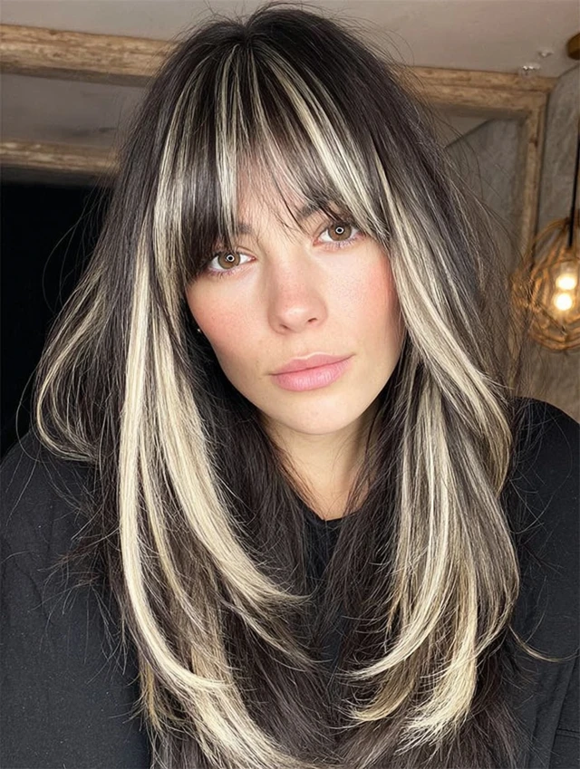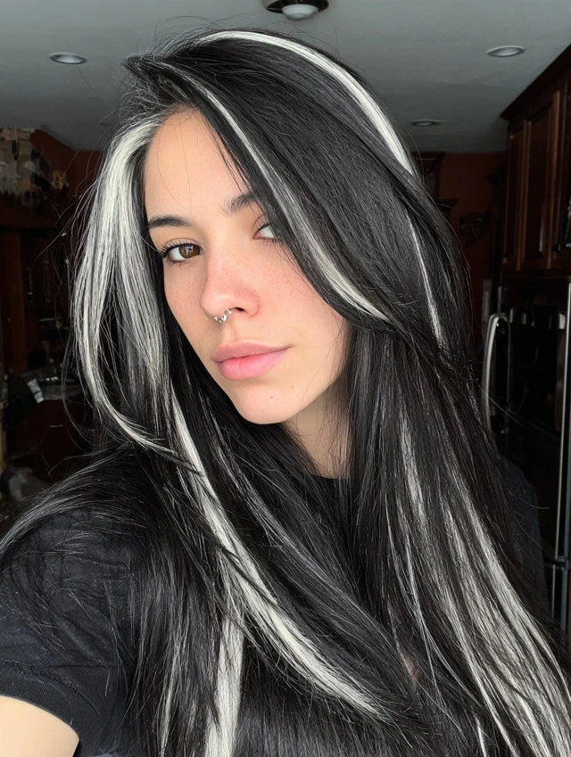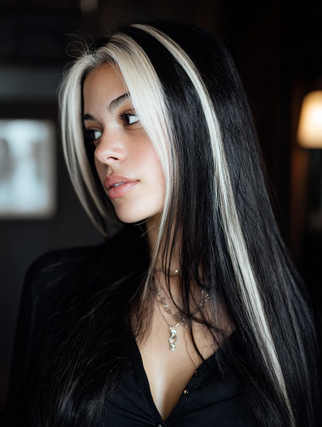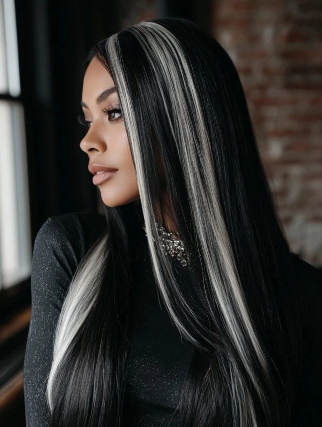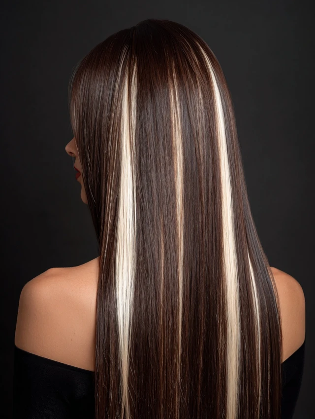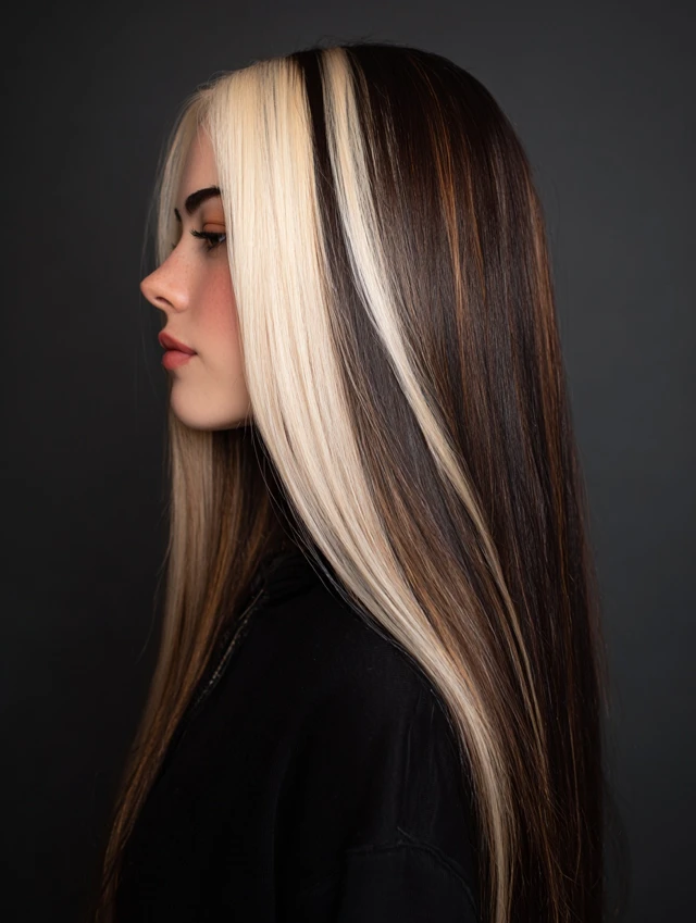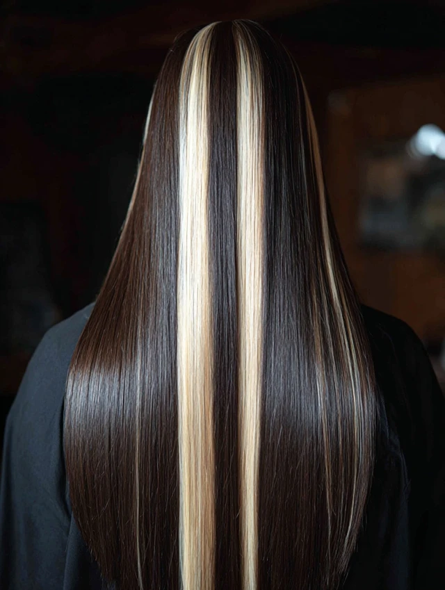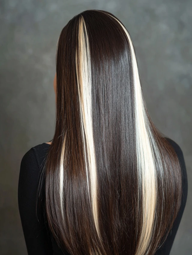 Long straight hair with bold streaks creates a sleek graphic effect. The contrast appears sharper on smooth strands. This works well for longer face shapes.