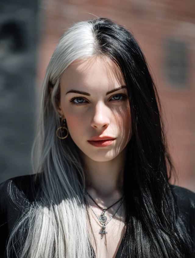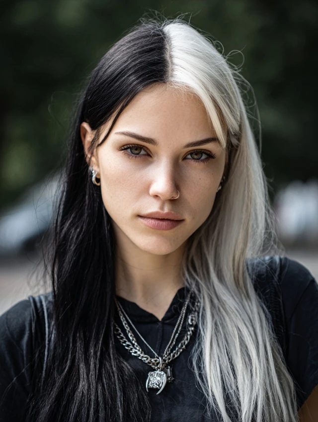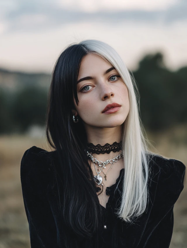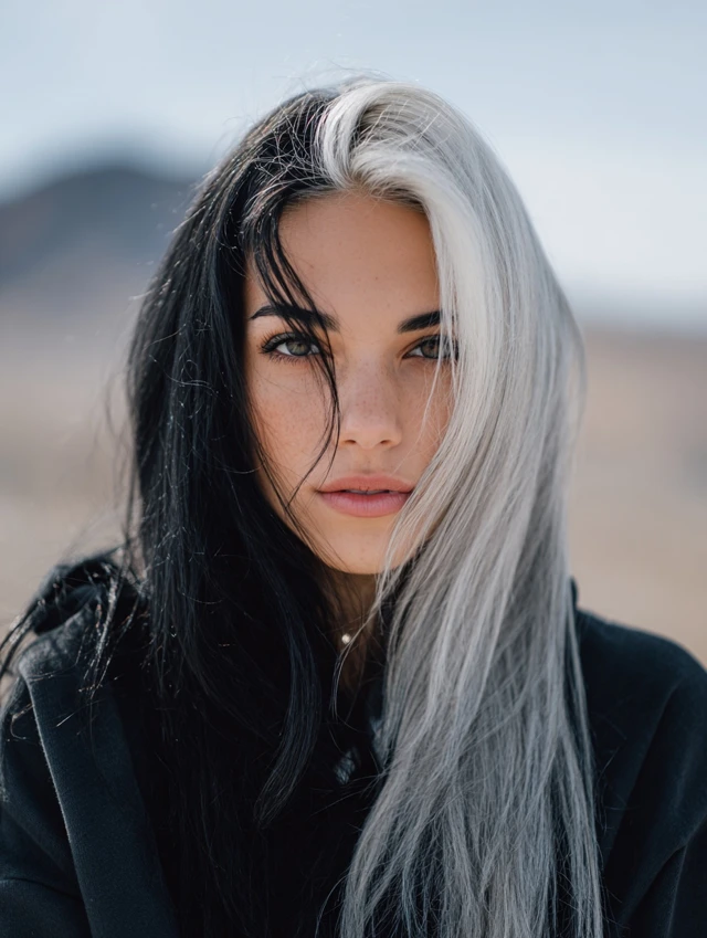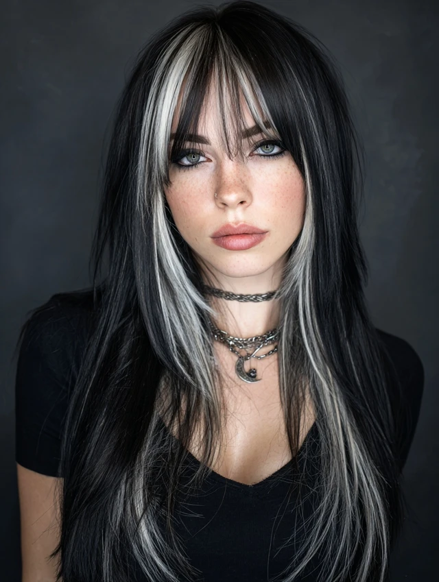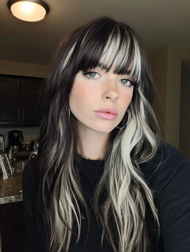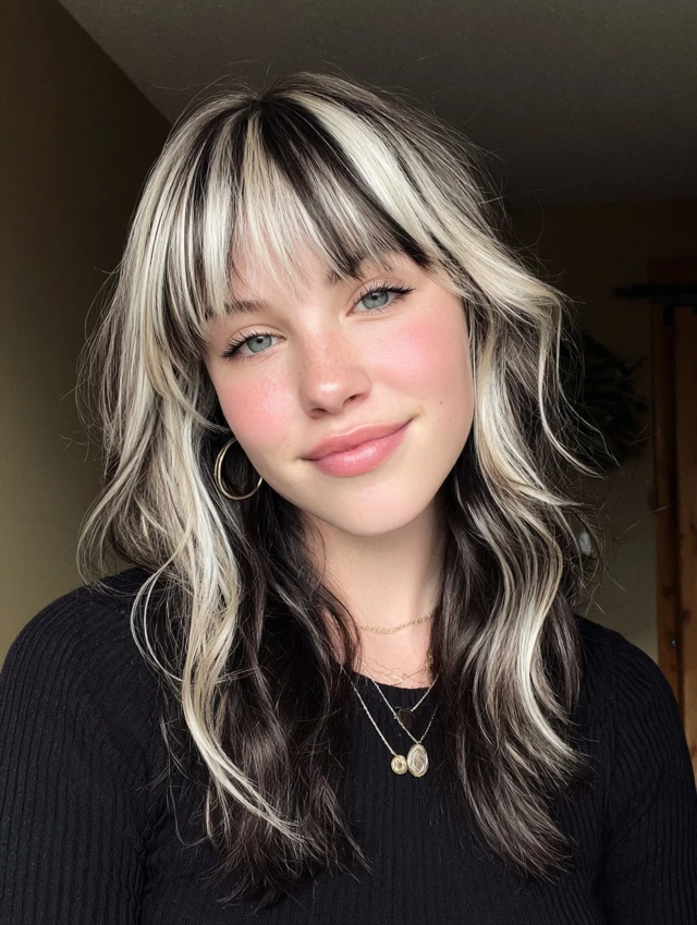 Y2K skunk hair works because of its contrast. The sharp difference between light and dark shades creates instant impact. The face-framing streaks draw attention to the eyes and cheekbones.