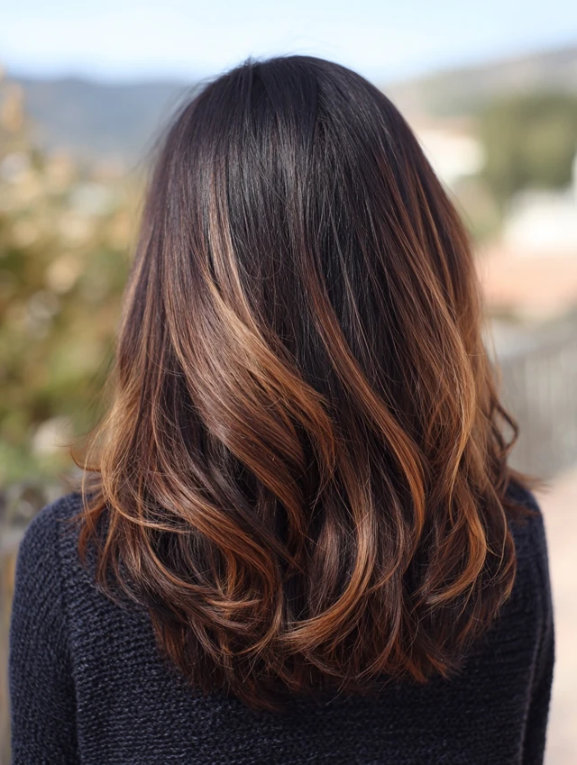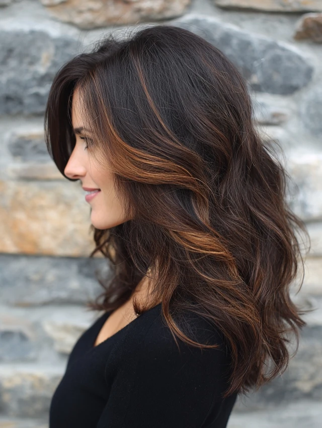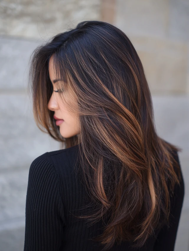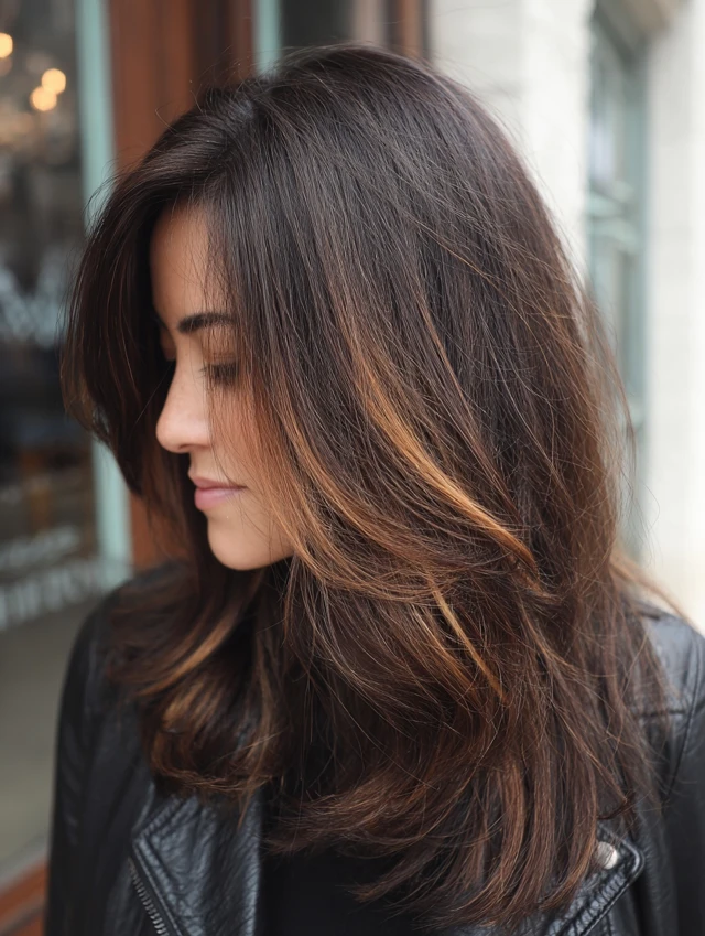 For a softer take, use deep brown with caramel streaks. The contrast stays visible but less dramatic. This works well for professional environments.